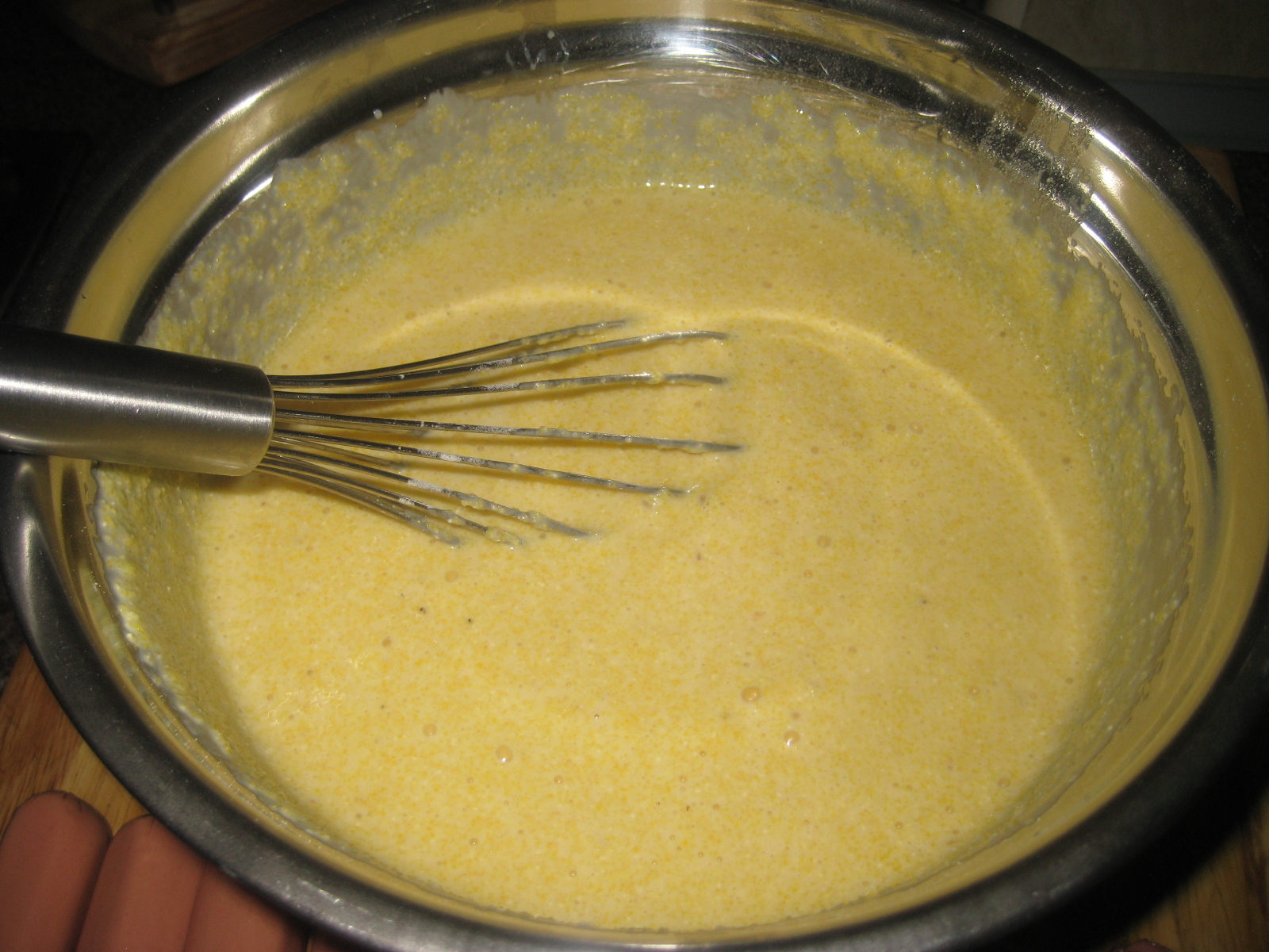 Add the baking powder, salt, paprika, corn meal and flour. (I used 2/3 flour and 1 1/3 corn meal and the texture did not form enough dough around the sausage when it cooked, so I decided to add more flour than corn meal. It worked better for me.)